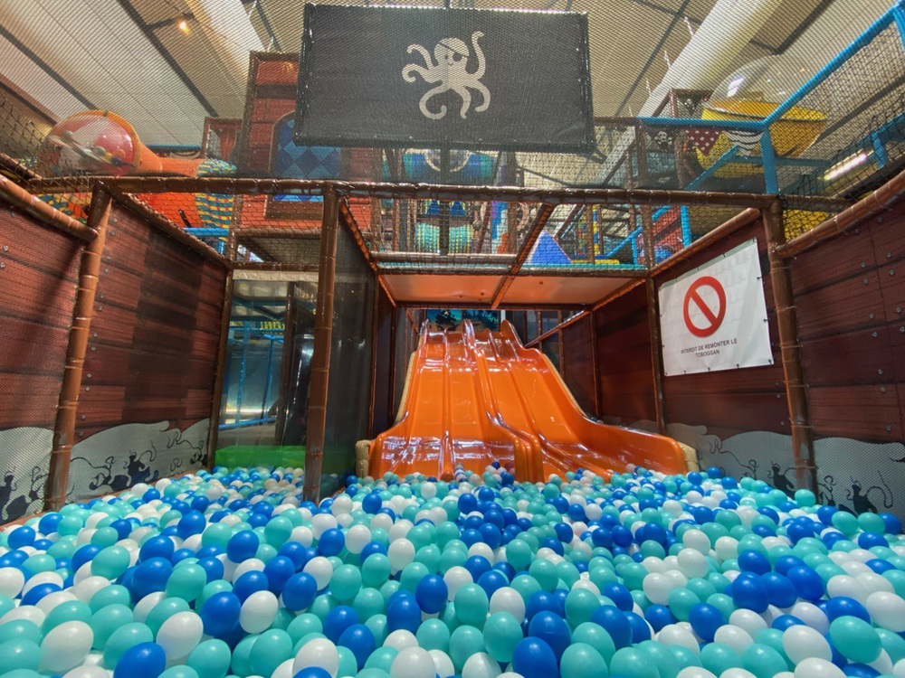 Notre aire de jeux propose une grande structure pour enfants de 1 à 12 ans : bateau pirate, canons à boules, toboggans, piscine à balles, terrain de foot, karts, et un espace dédié aux tout-petits.