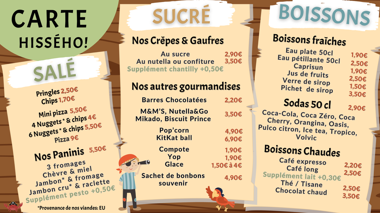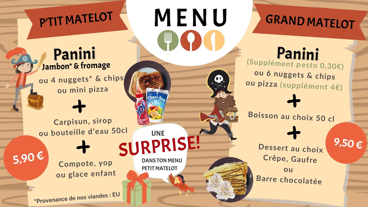 Ici, pas de rhum à l’horizon mais du Caprisun et d’autre nectar plus adapté pour étancher la soif des plus intrépides explorateurs. Alors, larguez les amarres et venez festoyer en famille, nous servons du sucré toute la journée et du salé entre midi et deux.